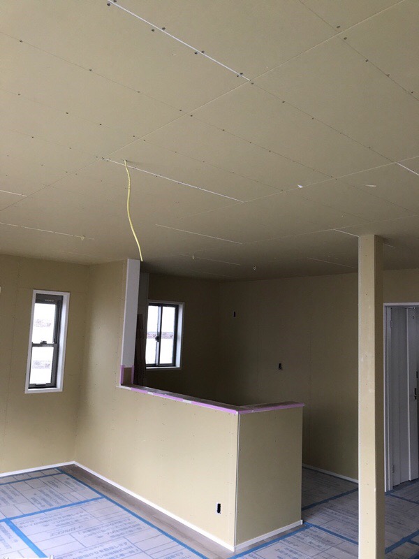 尼崎市の現場!ボード貼りです! 天井のボードを貼っています!形がいびつで苦労しました。。。 壁のボード完です!!GL貼りもやってます!!
